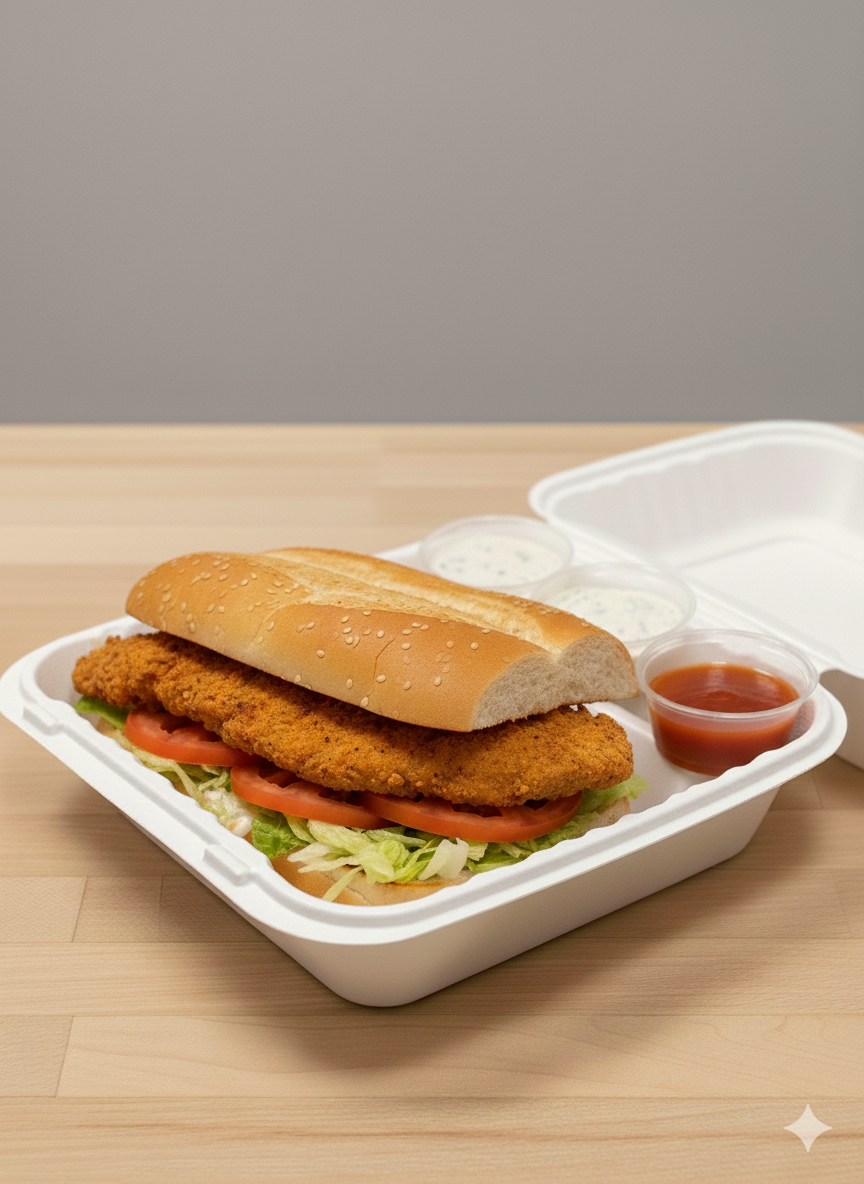 Crispy, golden chicken cutlet served on a soft hero roll with fresh lettuce, tomatoes, onions, bell peppers, and a layer of melted cheese for a hearty, flavorful sandwich.