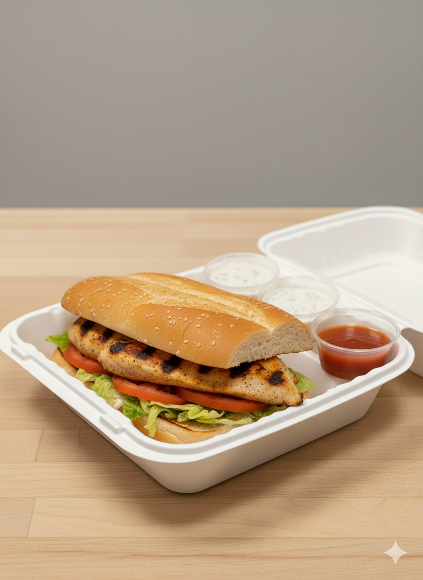 Tender, seasoned grilled chicken served on a soft hero roll with fresh lettuce, tomatoes, onions, bell peppers, and melted cheese for a flavorful and satisfying sandwich.