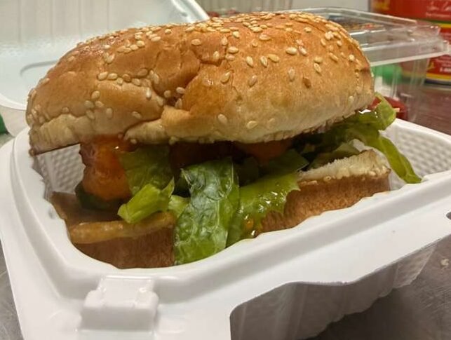 A perfectly crispy, golden chicken fillet coated in fiery seasoning, topped with fresh lettuce, tomatoes, and creamy spicy mayo, all on a soft toasted bun for a hot, crunchy kick in every bite.