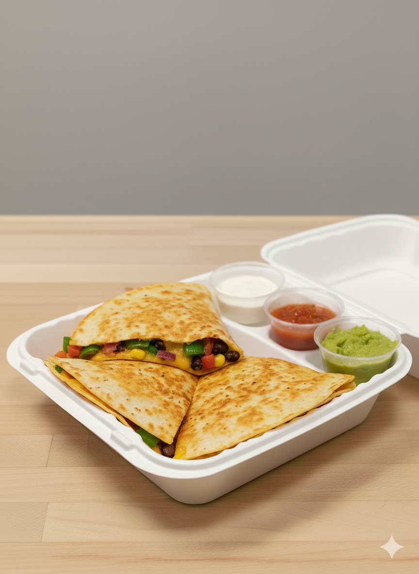 Grilled flour tortilla filled with melted cheese, onions, bell peppers, and tomatoes, served with a side of tangy sour cream and fresh salsa for a colorful, cheesy, and satisfying vegetarian option.